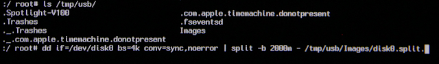 - dd if=/dev/disk0 bs=4k conv=sync,noerror | split -b 2000m – /tmp/usb/disk0.split. (FAT32 USB)
