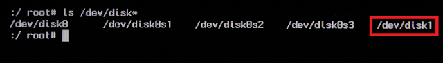 For this system the FAT32 USB drive has been inserted, which shows up as /dev/disk1. The partition that needs to be mounted is /dev/disk1s1: