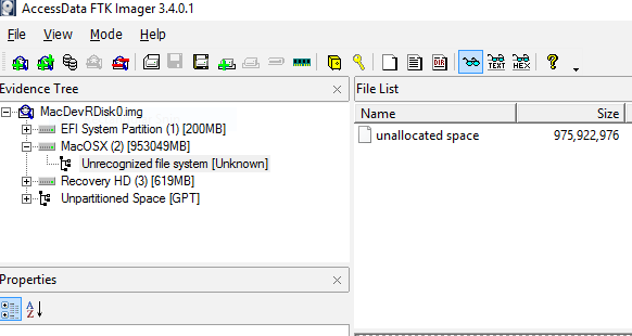 During my testing, I imaged both /dev/rdisk0 and /dev/rdisk1. /dev/rdisk0 was the entire disk with all three partitions. Opening the rdisk0 image in FTK Imager confirms that all three partitions are present. As expected partition 2, MacOSX, is showing as an unrecognized file system because it is encrypted: