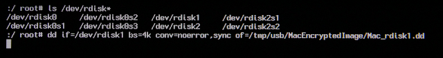 For the encrypted drive, this example will be of /dev/rdisk1. Since the image will be saved to an HFS USB drive there is no need to split the image: